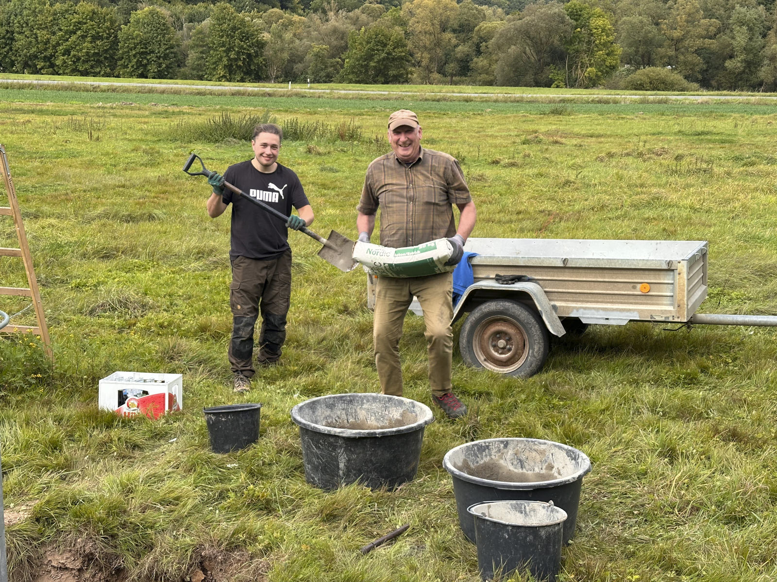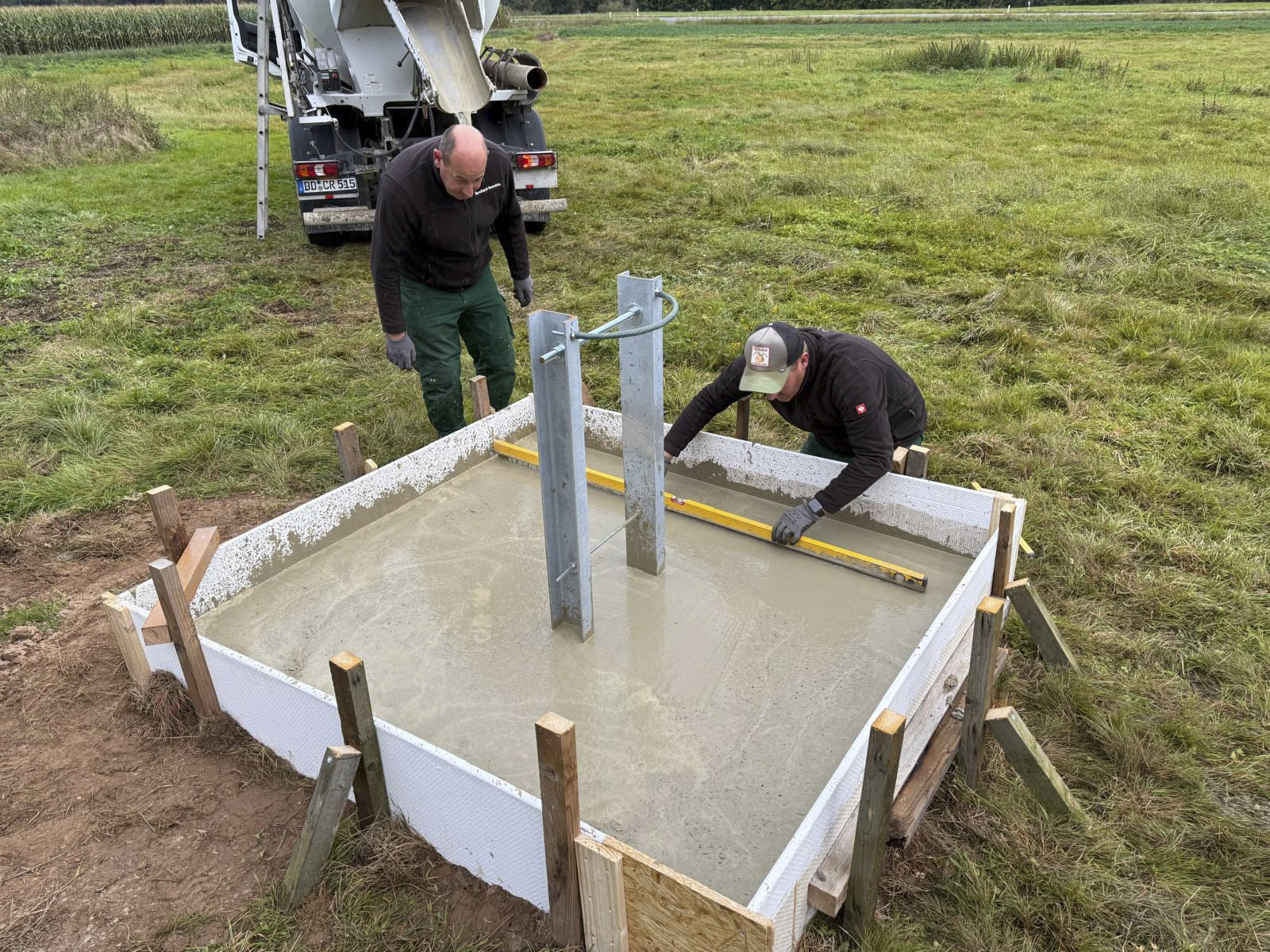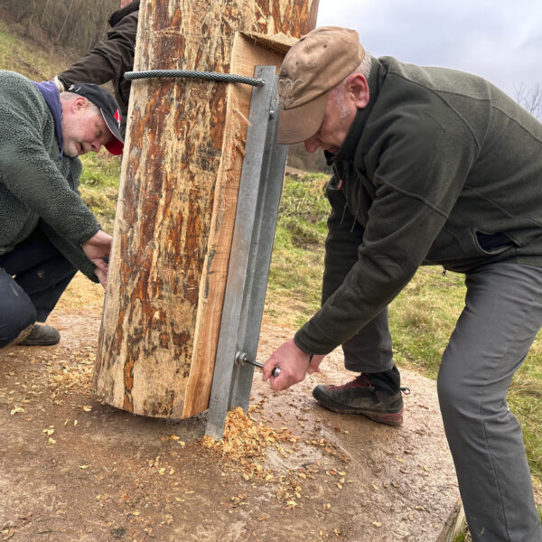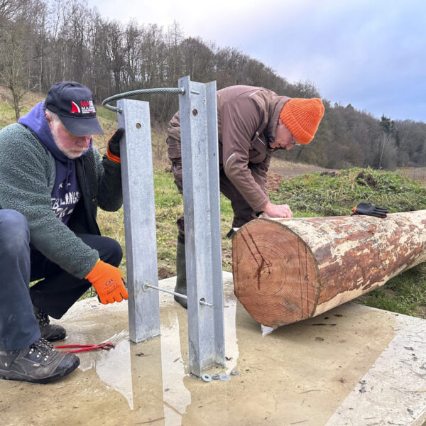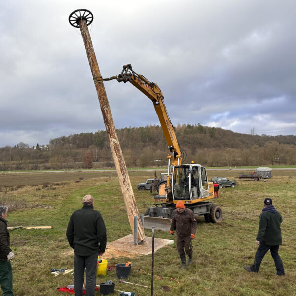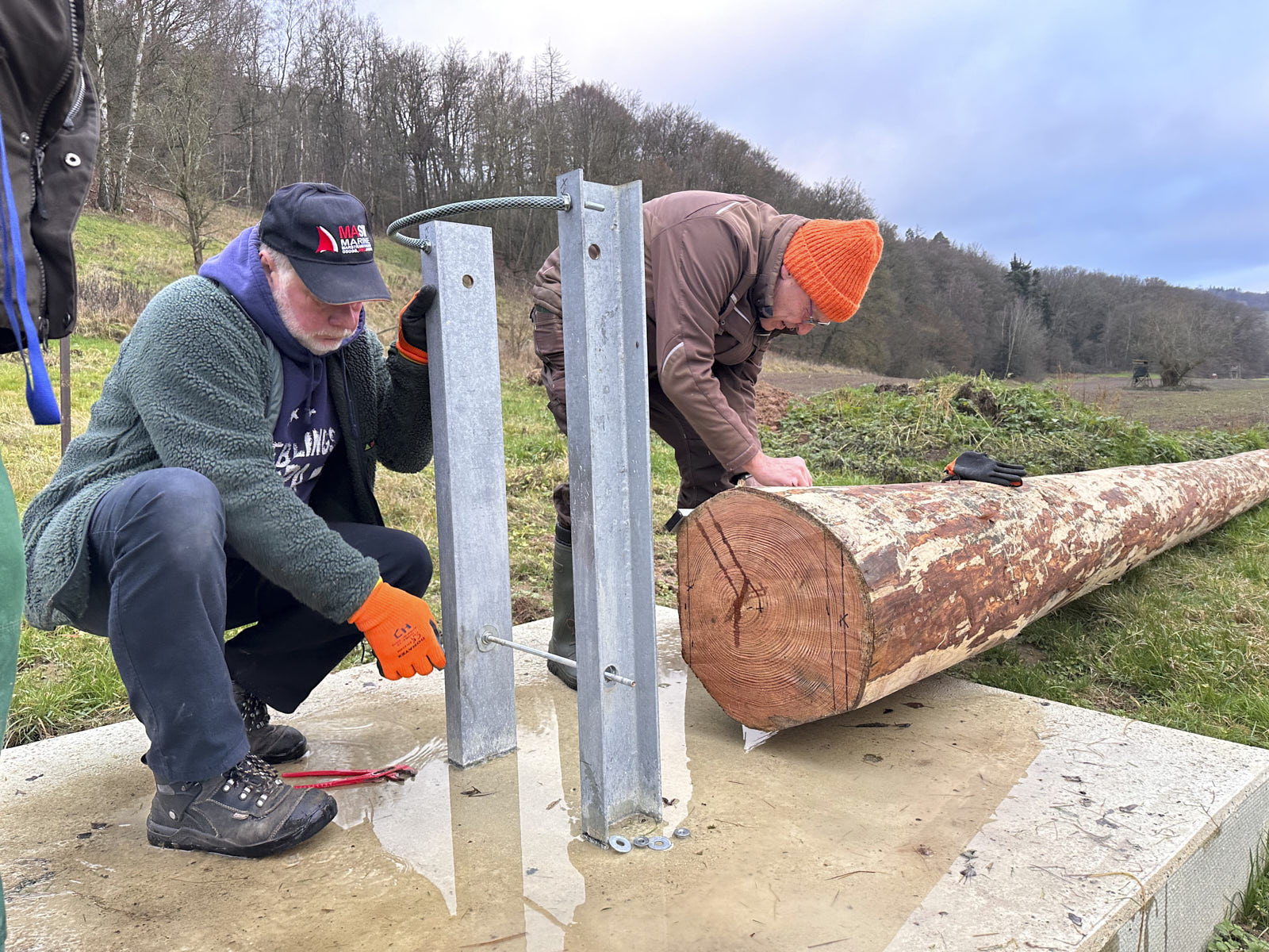 Es folgte eine gemeinsame Planung: Alle notwendigen Genehmigungen wurden eingeholt, Baufragen geklärt und die statischen Anforderungen für den Hochstamm ermittelt. Auf der Suche nach einem geeigneten Aufstellort wurde auf dem Privatgrundstück eines Vereinsmitglieds des ASV Costa Cörla e.V., das direkt an das Vereinsgewässer angrenzt, schnell ein passender Platz gefunden. Als Basis für die Verankerung wurde ein schweres Grundgestell geschweißt und im erforderlichen Fundament fest betoniert.