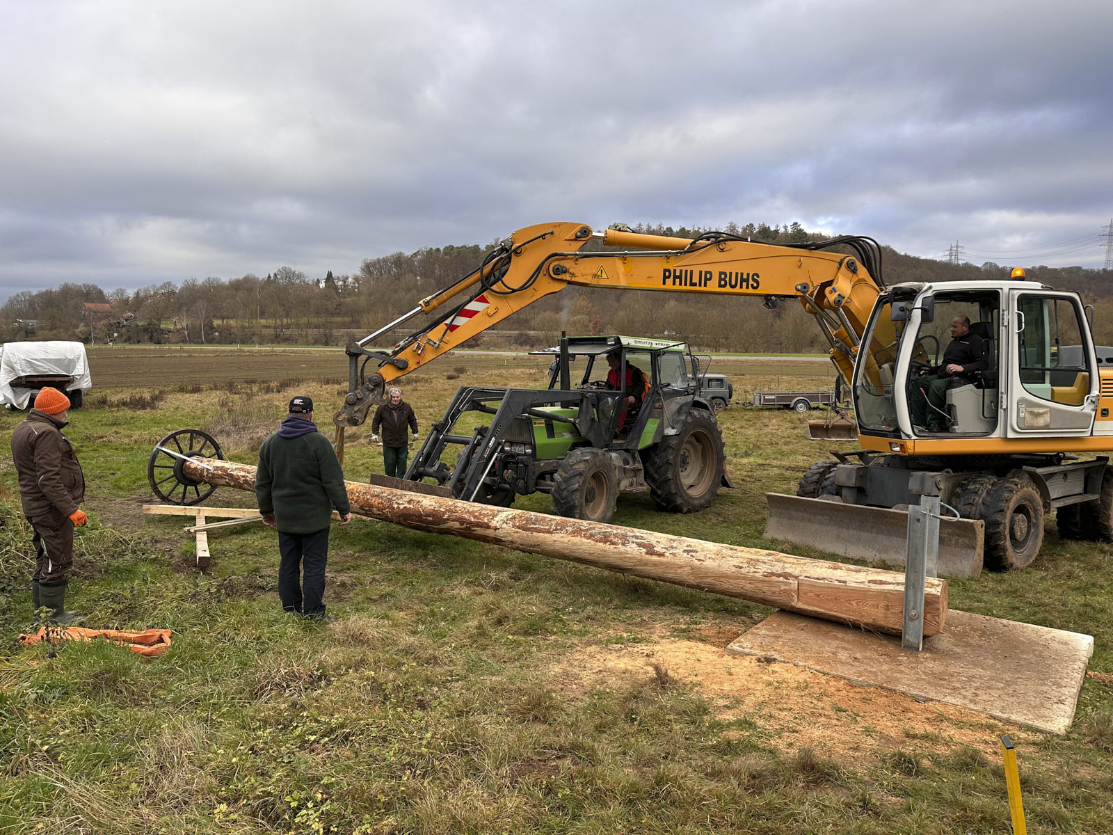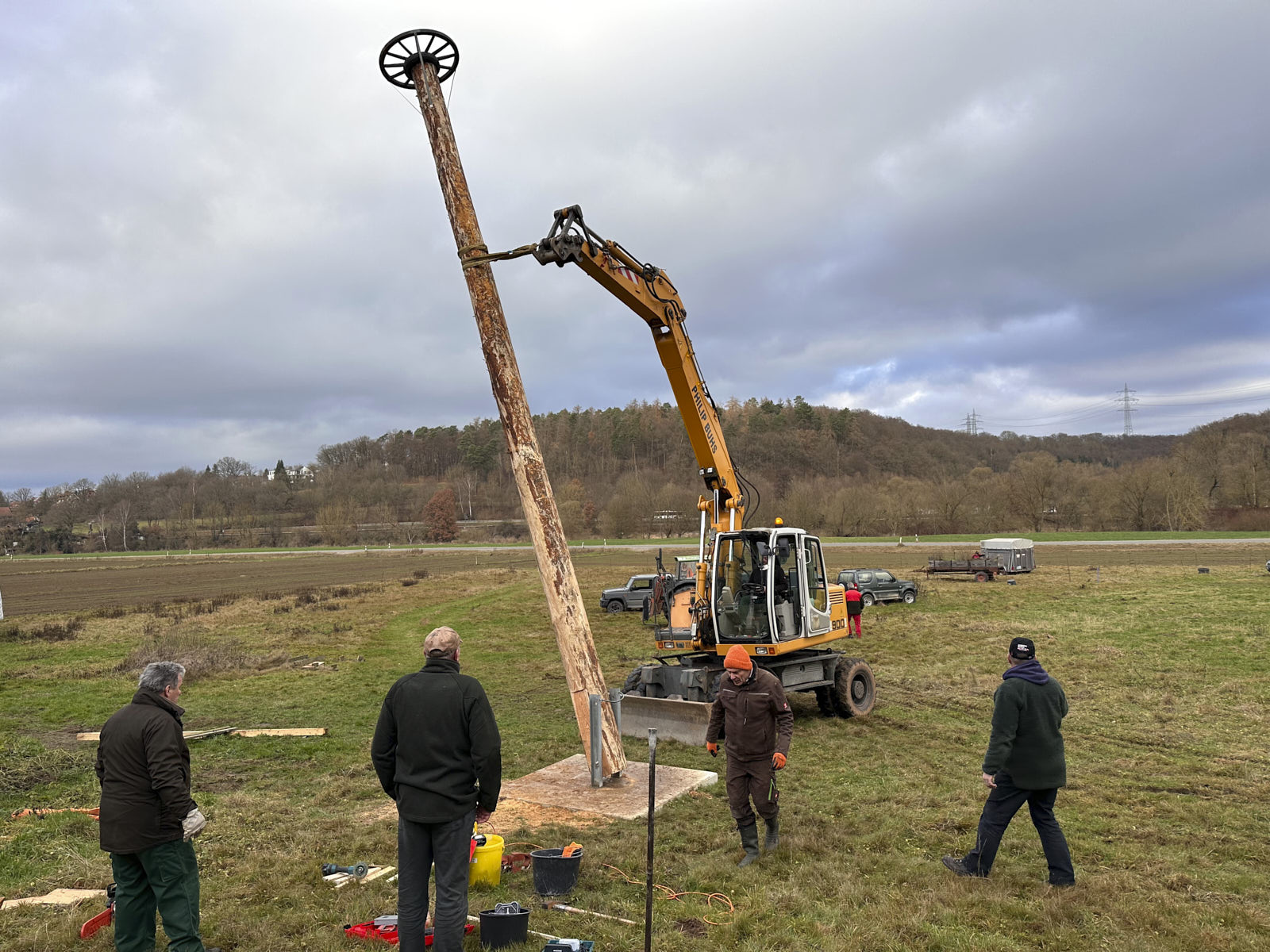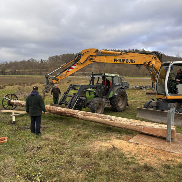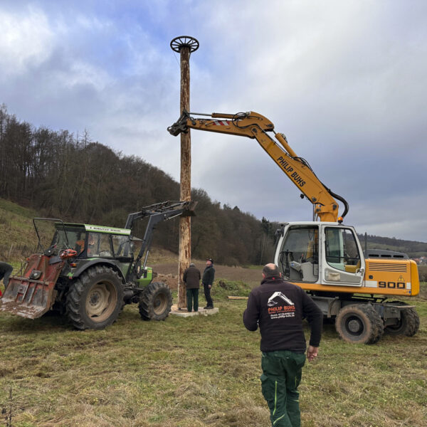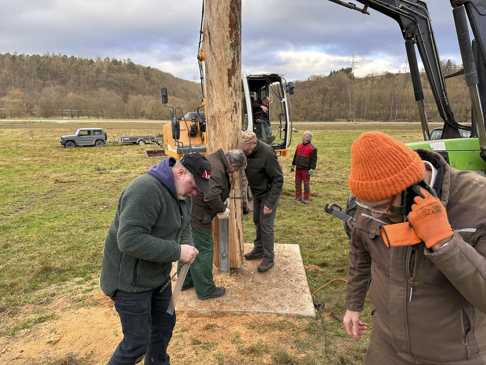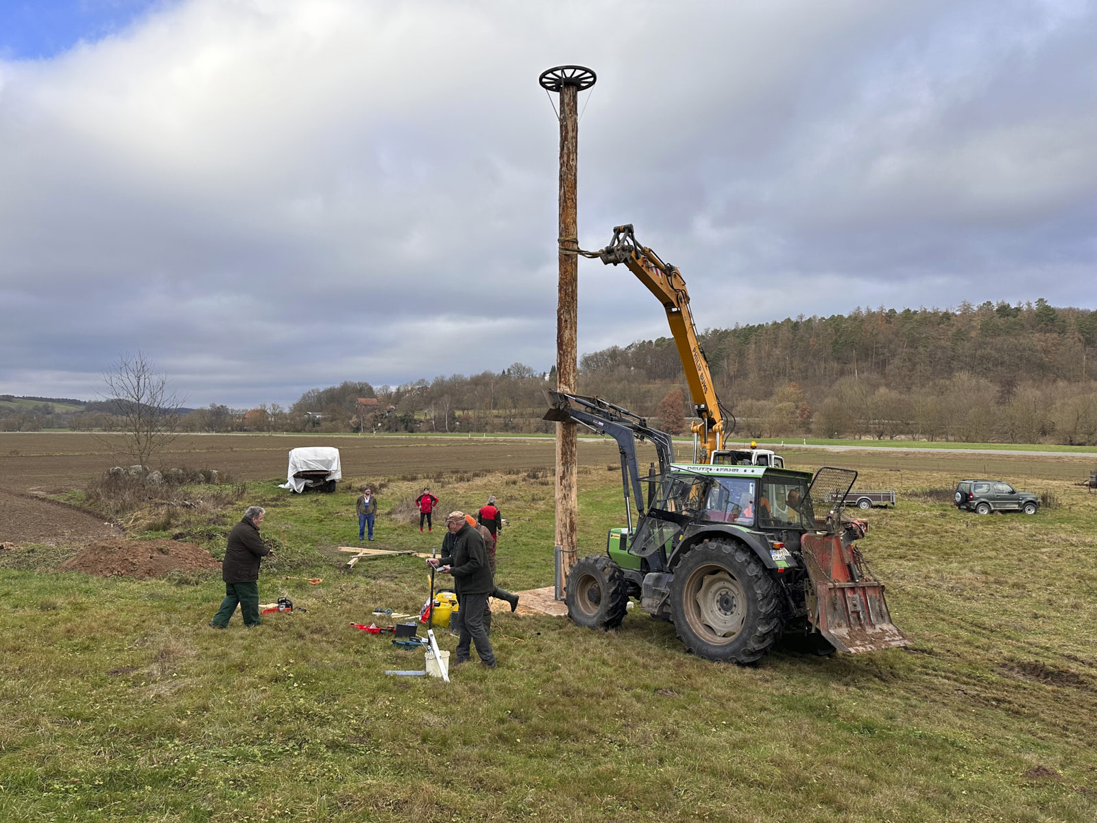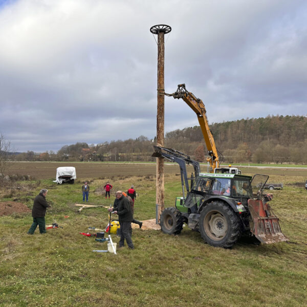 Das Storchennest selbst entstand aus einem Lärchenstamm, der uns dankenswerterweise vom Forstamt Melsungen zur Verfügung gestellt wurde. In Handarbeit wurde der Stamm geschält und für das Nest vorbereitet. Für das eigentliche Plateau konnte nach einigen Telefonaten ein altes Wagenrad in einer Scheune gefunden und restauriert werden. Heute am 15. Dezember konnte der Stamm schließlich erfolgreich aufgestellt werden.