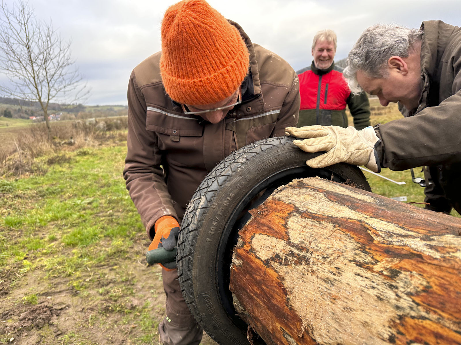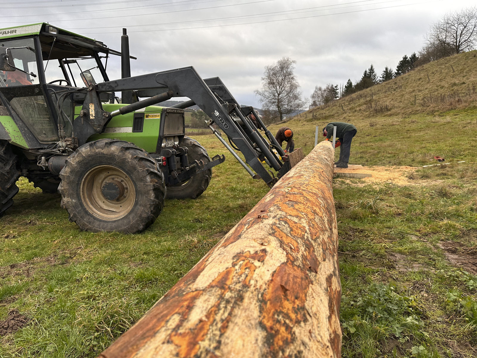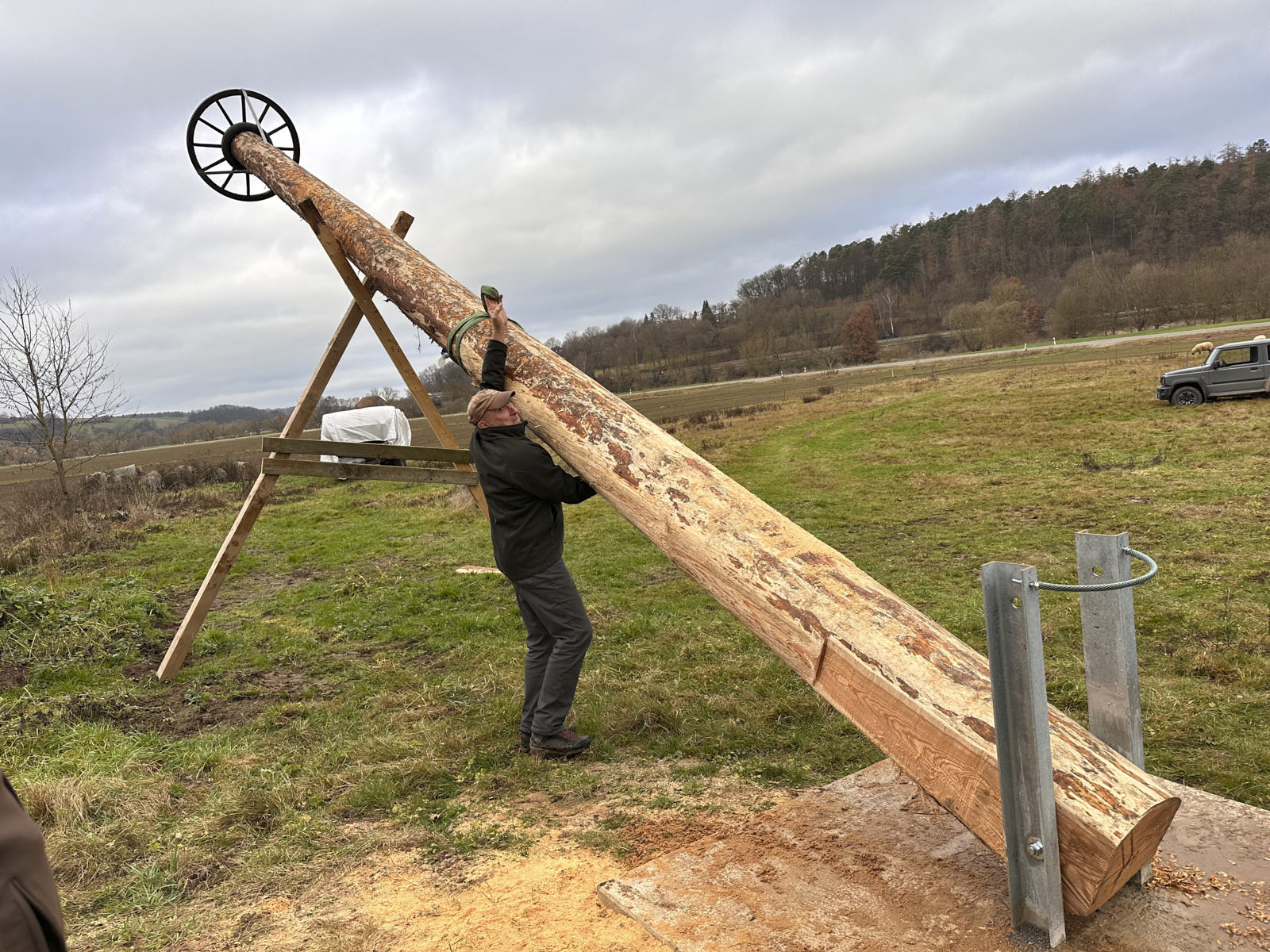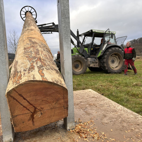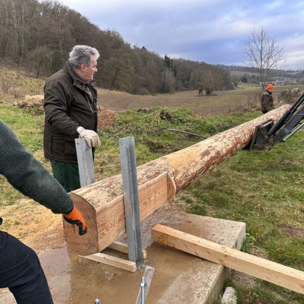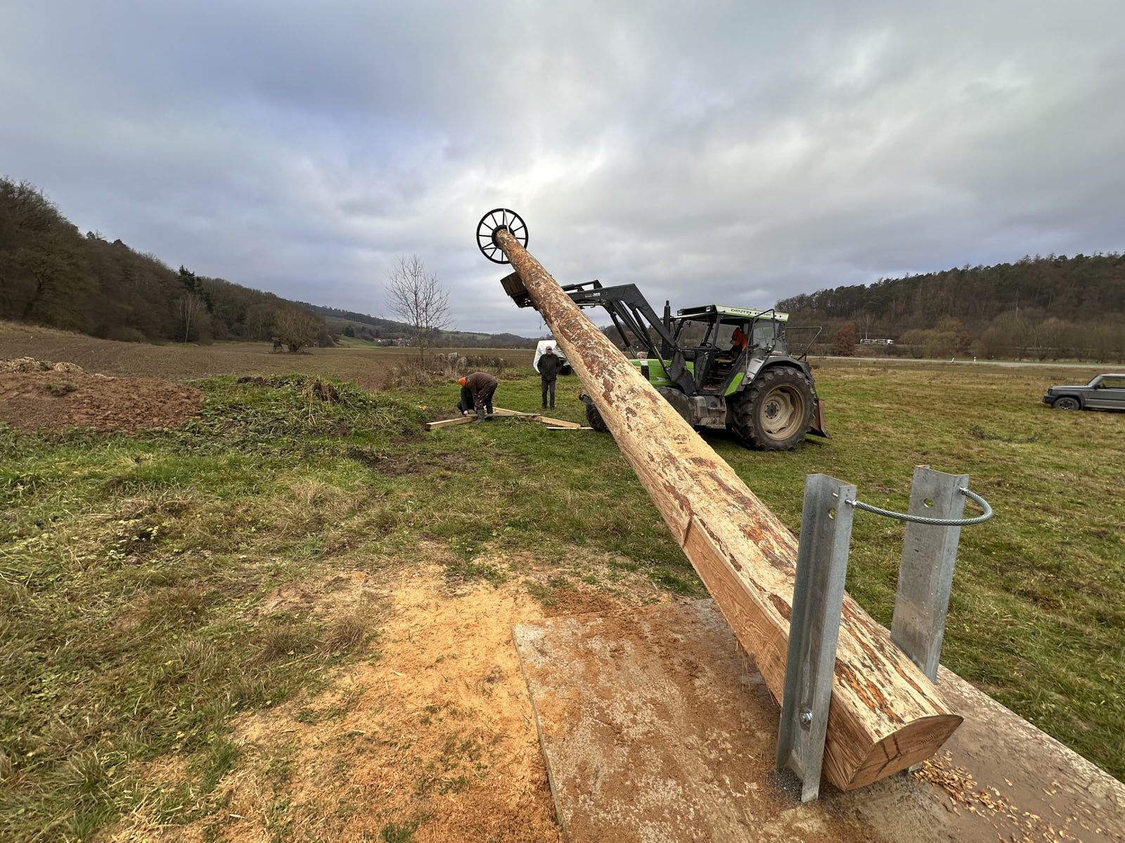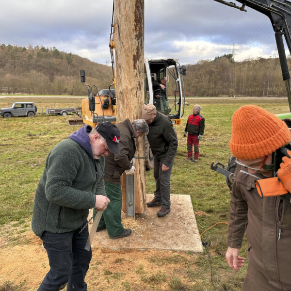 Das Storchennest selbst entstand aus einem Lärchenstamm, der uns dankenswerterweise vom Forstamt Melsungen zur Verfügung gestellt wurde. In Handarbeit wurde der Stamm geschält und für das Nest vorbereitet. Für das eigentliche Plateau konnte nach einigen Telefonaten ein altes Wagenrad in einer Scheune gefunden und restauriert werden. Heute am 15. Dezember konnte der Stamm schließlich erfolgreich aufgestellt werden.