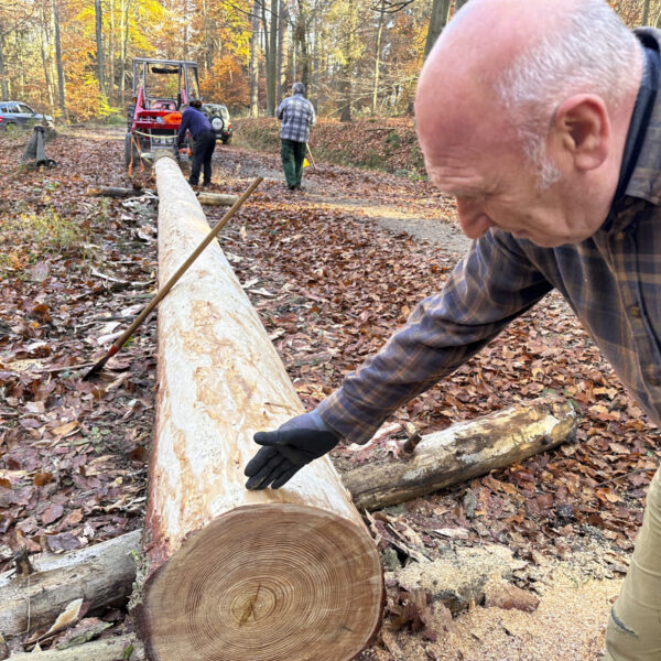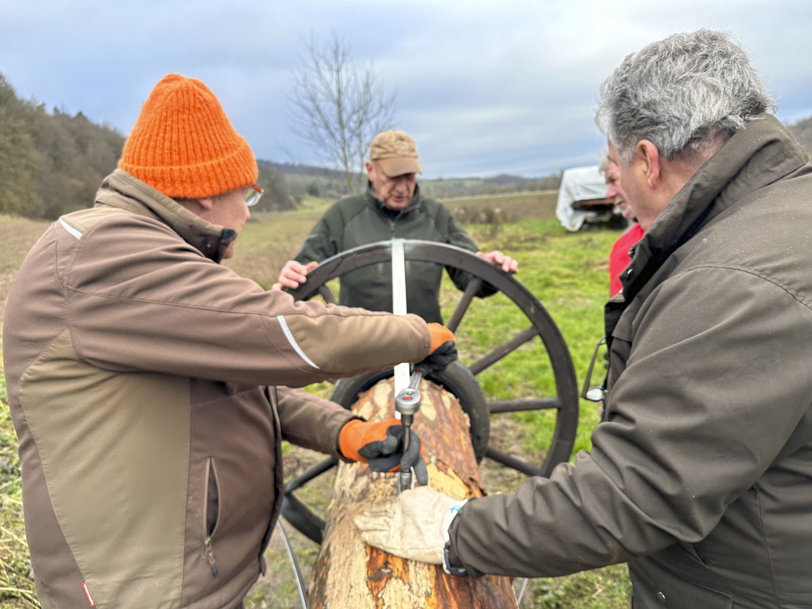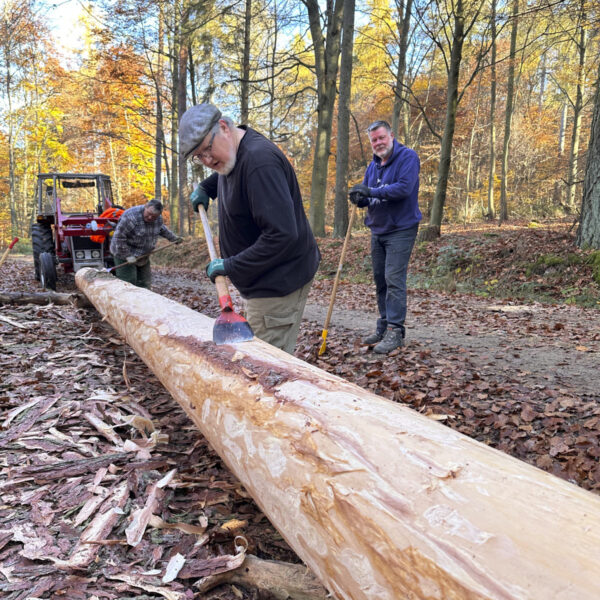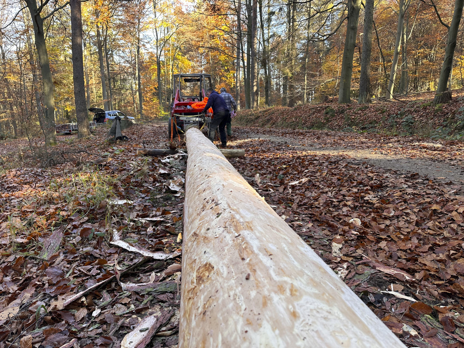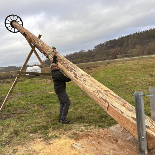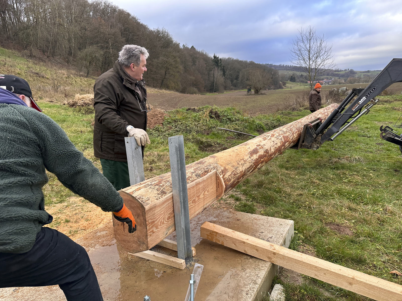 Das Storchennest selbst entstand aus einem Lärchenstamm, der uns dankenswerterweise vom Forstamt Melsungen zur Verfügung gestellt wurde. In Handarbeit wurde der Stamm geschält und für das Nest vorbereitet. Für das eigentliche Plateau konnte nach einigen Telefonaten ein altes Wagenrad in einer Scheune gefunden und restauriert werden. Heute am 15. Dezember konnte der Stamm schließlich erfolgreich aufgestellt werden.
