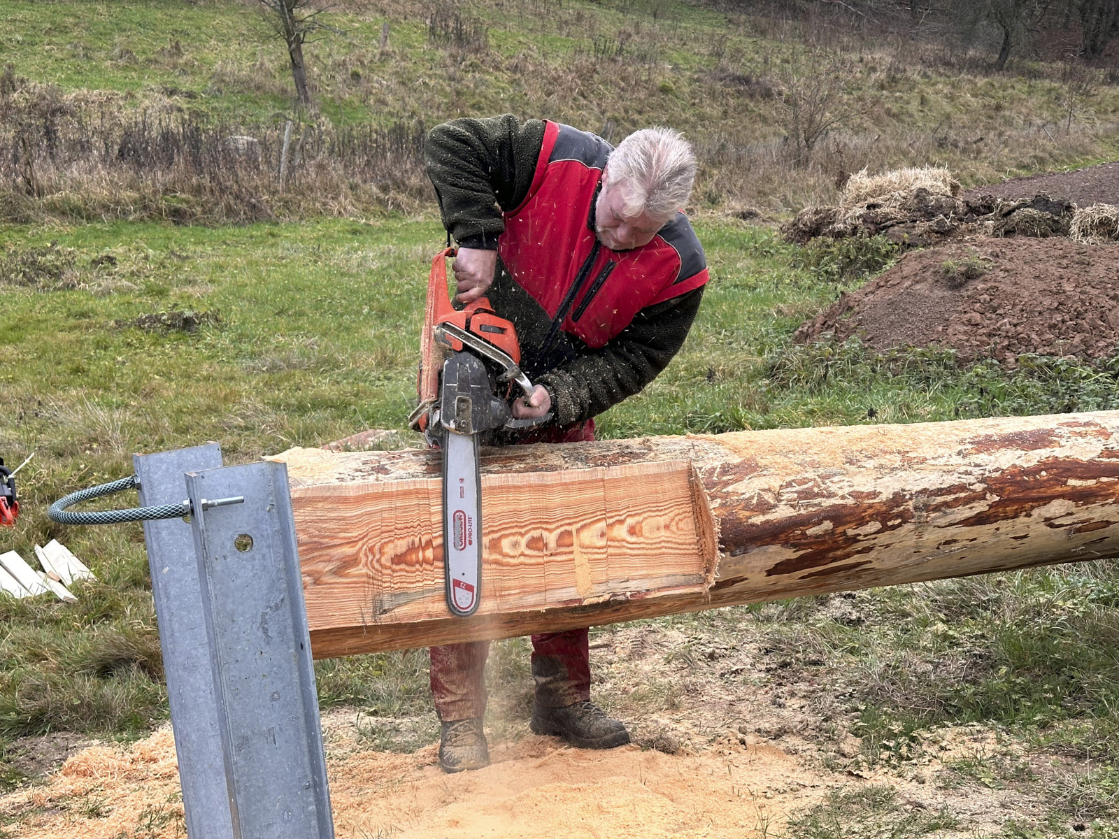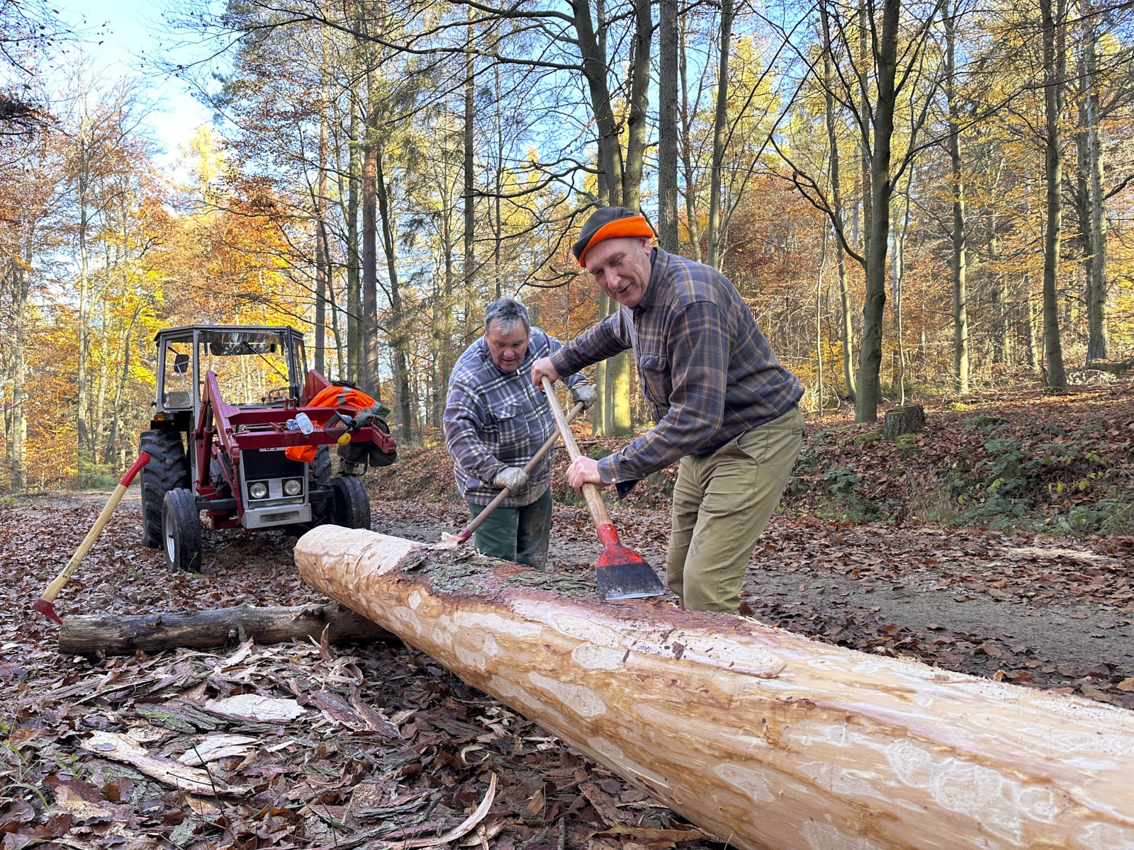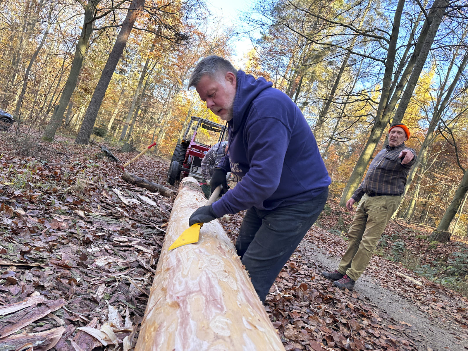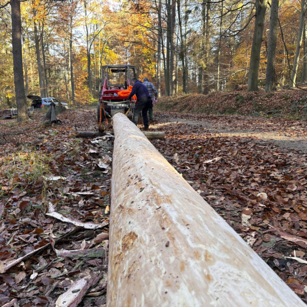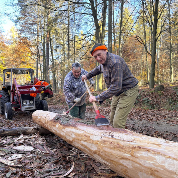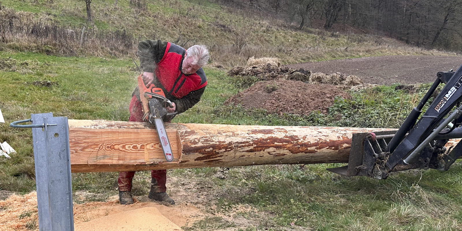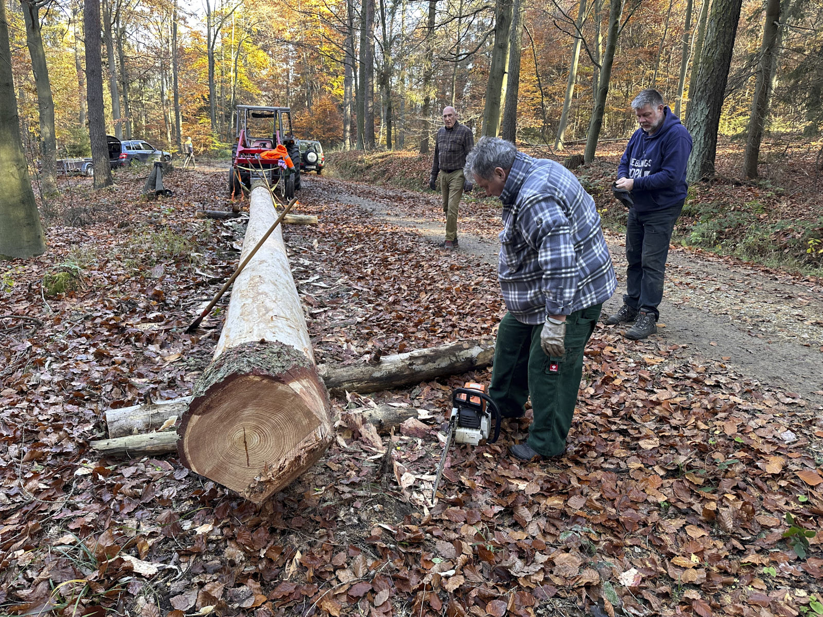 Das Storchennest selbst entstand aus einem Lärchenstamm, der uns dankenswerterweise vom Forstamt Melsungen zur Verfügung gestellt wurde. In Handarbeit wurde der Stamm geschält und für das Nest vorbereitet. Für das eigentliche Plateau konnte nach einigen Telefonaten ein altes Wagenrad in einer Scheune gefunden und restauriert werden. Heute am 15. Dezember konnte der Stamm schließlich erfolgreich aufgestellt werden.