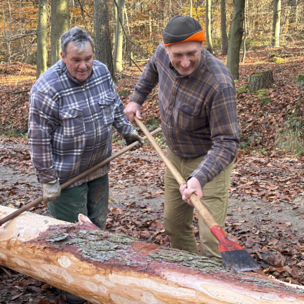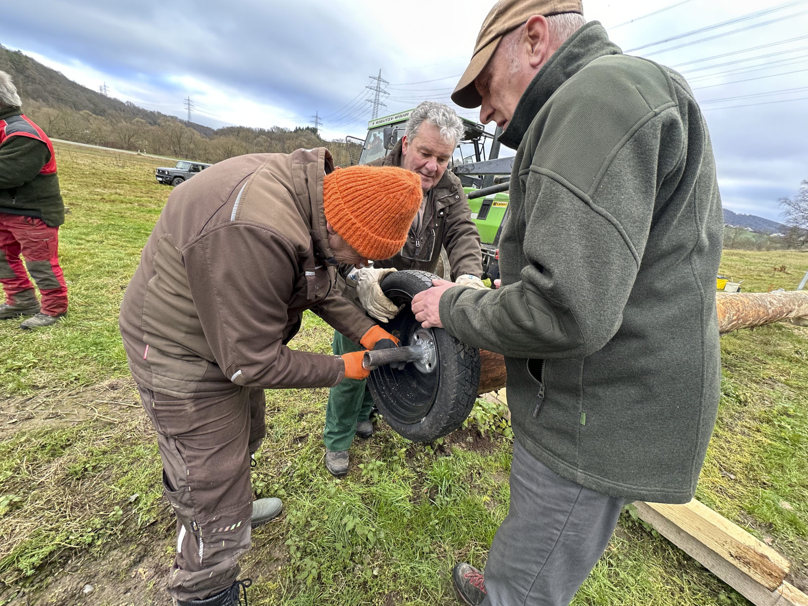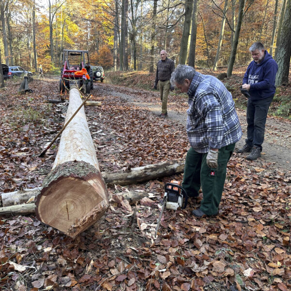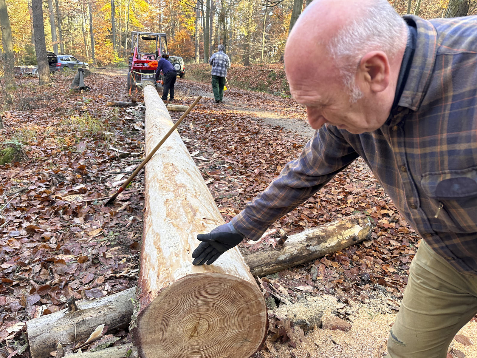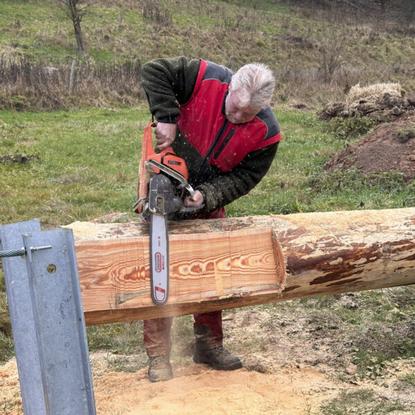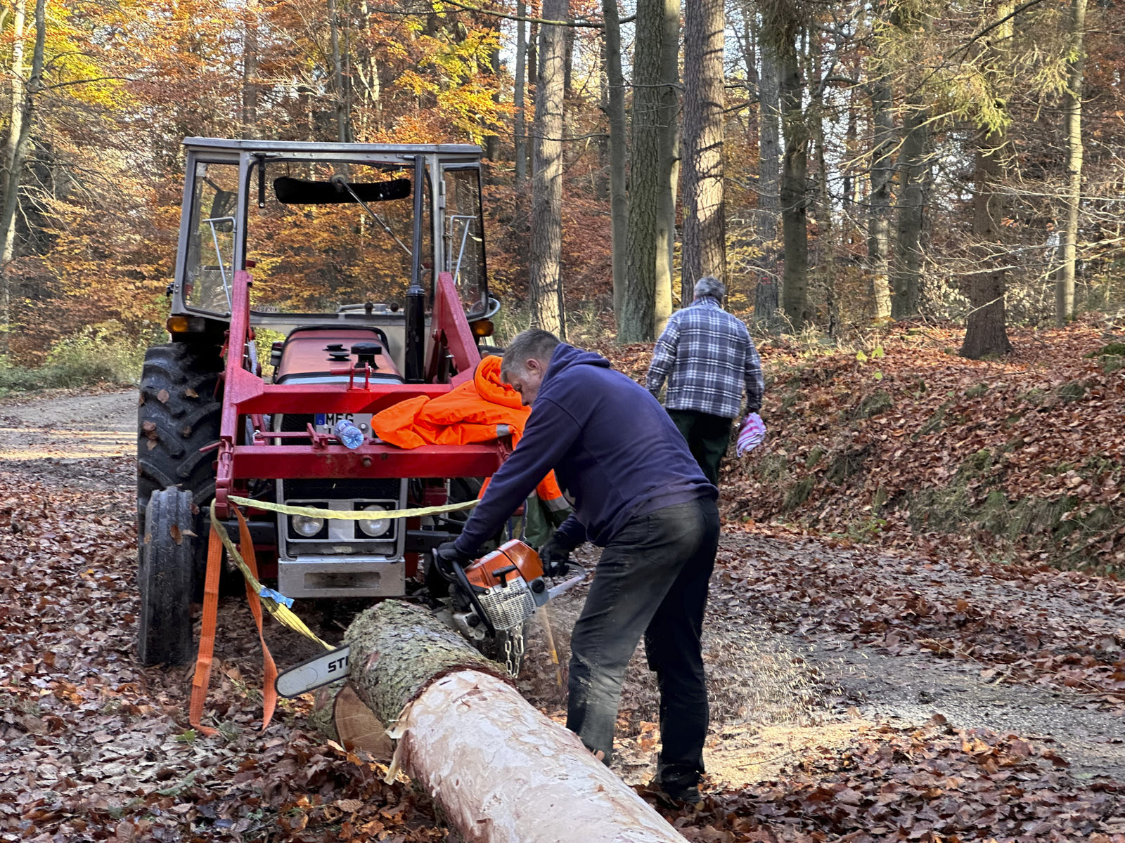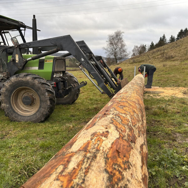 Das Storchennest selbst entstand aus einem Lärchenstamm, der uns dankenswerterweise vom Forstamt Melsungen zur Verfügung gestellt wurde. In Handarbeit wurde der Stamm geschält und für das Nest vorbereitet. Für das eigentliche Plateau konnte nach einigen Telefonaten ein altes Wagenrad in einer Scheune gefunden und restauriert werden. Heute am 15. Dezember konnte der Stamm schließlich erfolgreich aufgestellt werden.