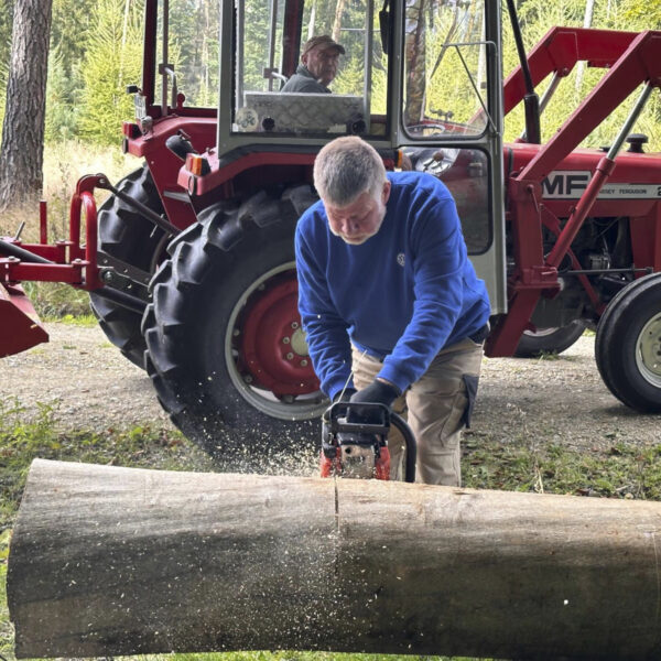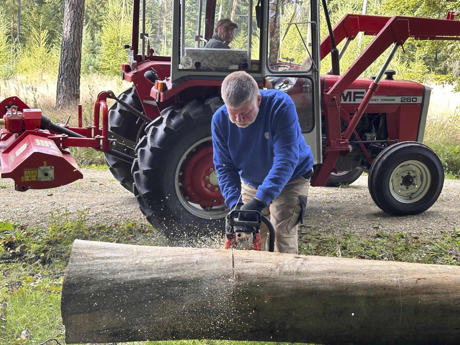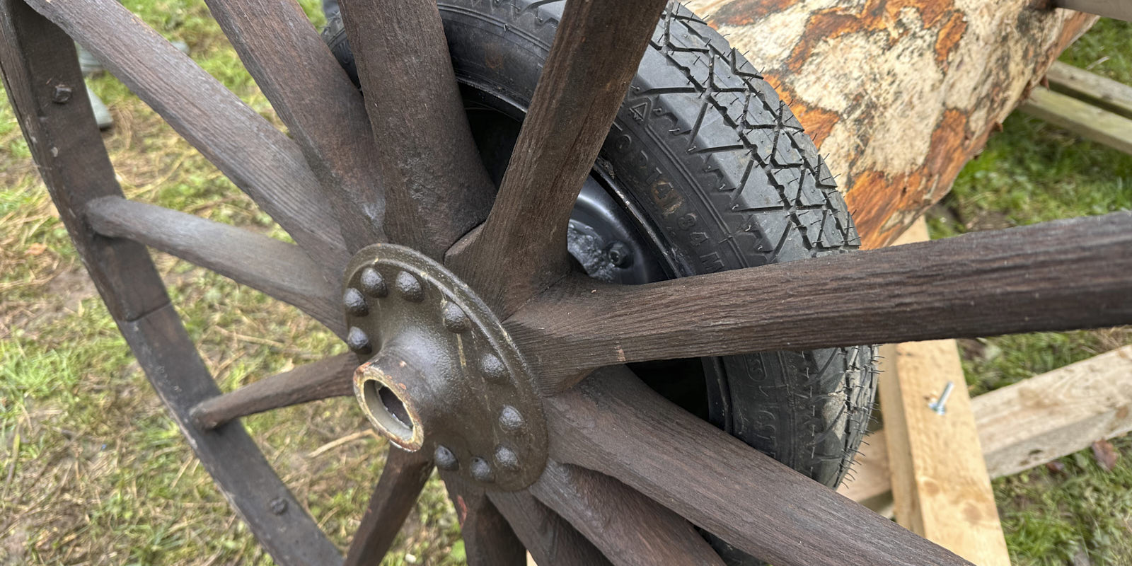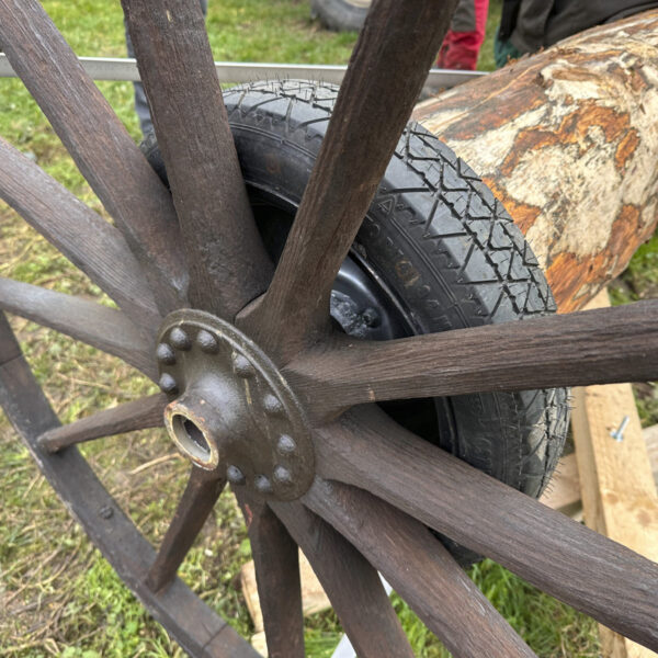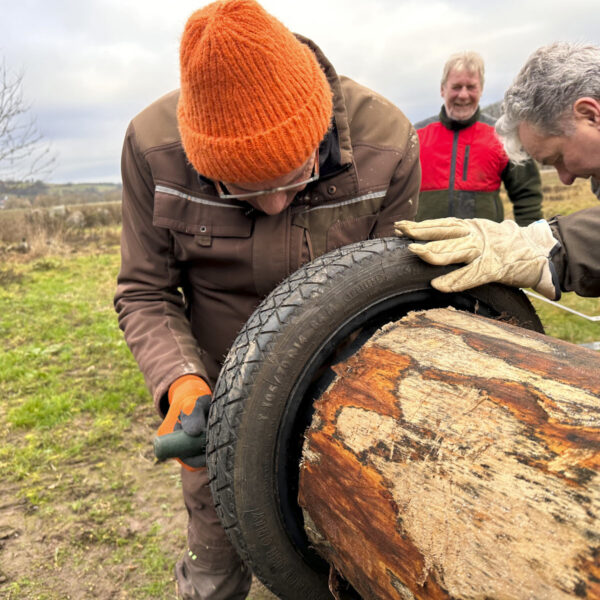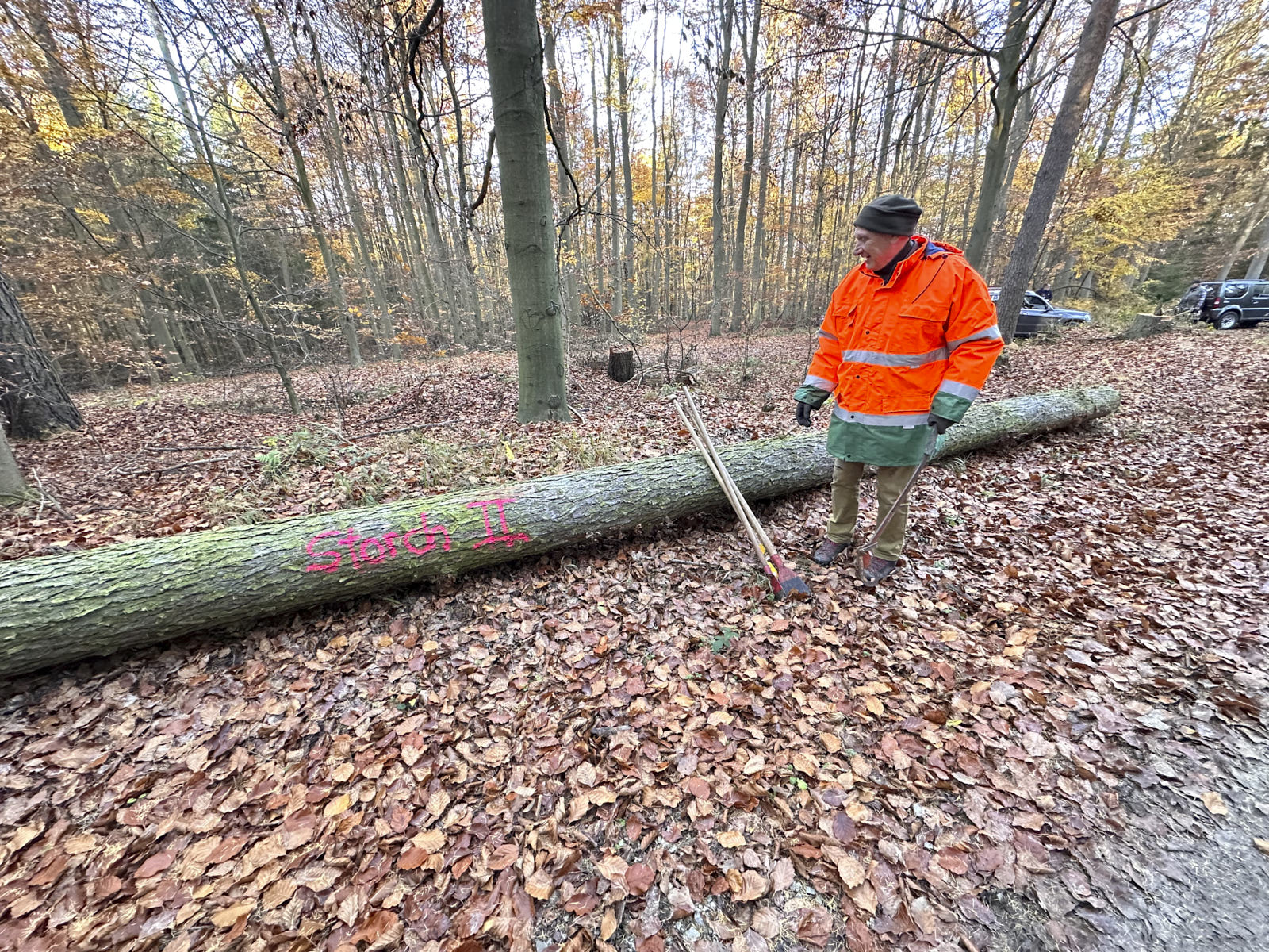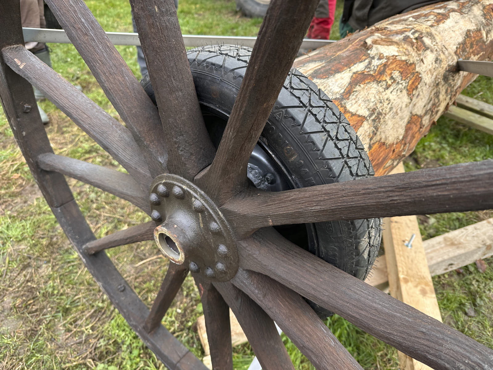 Das Storchennest selbst entstand aus einem Lärchenstamm, der uns dankenswerterweise vom Forstamt Melsungen zur Verfügung gestellt wurde. In Handarbeit wurde der Stamm geschält und für das Nest vorbereitet. Für das eigentliche Plateau konnte nach einigen Telefonaten ein altes Wagenrad in einer Scheune gefunden und restauriert werden. Heute am 15. Dezember konnte der Stamm schließlich erfolgreich aufgestellt werden.